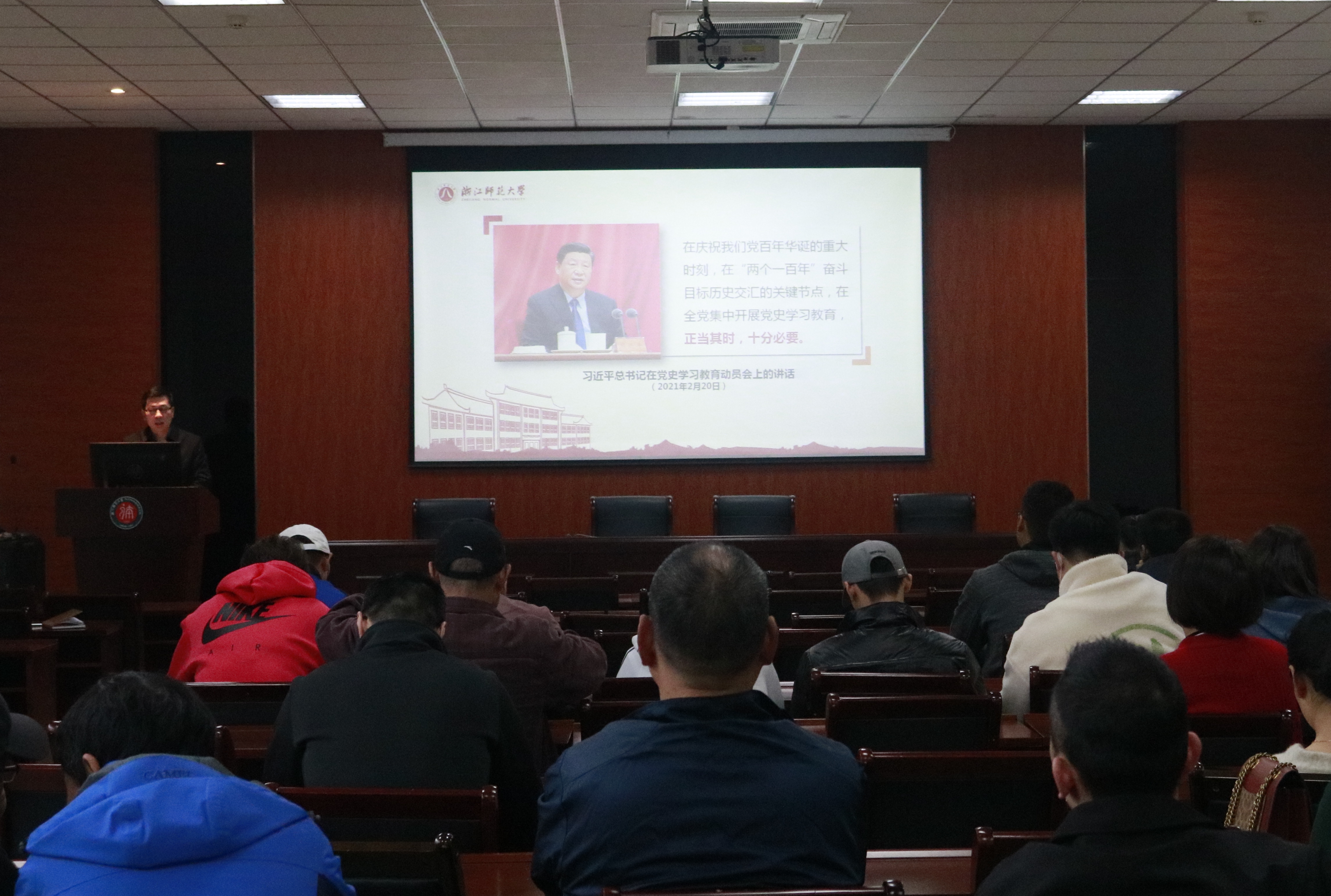 姜洪友以全国“时代楷模”陈立群的先进事迹勉励全体教职工,号召大家学习陈立群校友自觉担当立德树人、教书育人的使命,树师表、铸师魂、弘师道。他希望通过本次“同上一堂党史课”主题宣讲,全体教职工要紧紧围绕学党史、悟思想、办实事、开新局,守好红色根脉、奋力争先创优、践行“五大历史使命”,为建设特色鲜明的一流大学而共同努力,以实际行动和优异成绩庆祝中国共产党成立100周年。