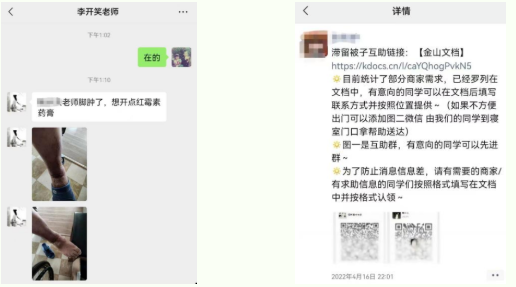 学院党委组织开展互助送温暖活动,保证特殊时期老师们的基本生活需求。院办老师了解到有老师在外面小区没有吃的,买了东西之后及时送到对方手中;知道有老师准备返金,专门跑到高速路口询问相关政策;同时,点对点关心高龄、孤寡、身体不好的退休教师。教工党支部的成员中,有的主动为同事购买食物或赠送食物,有的为住在校外的老师查找校内的教学材料和教学物资并传送到家;辅导员和班主任通过线上线下相结合的方式深入学生,加强思想引导,做好行为管控,做好特殊学生群体的关心关爱和困难帮扶,第一时间为学生排忧解难。体育教育203班的李颜绮同学和文传学院的两位同学在朋友圈里发现校内商户缺被子,及时创建了《滞留被子互助》的共享文档,在短短1小时之内就汇聚了14条求助信息,收到18位同学的援助。