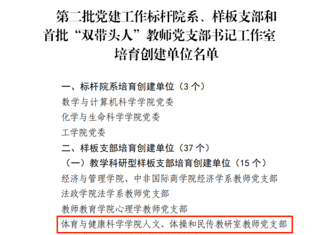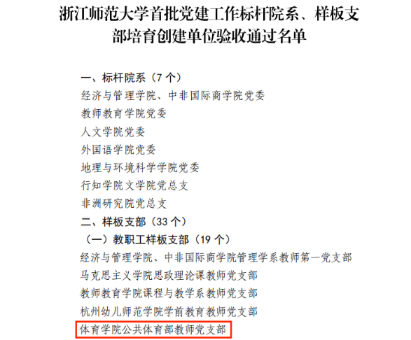 近日,kaiyun开云官方网站党委公布首批党建工作标杆院系、样板支部培育创建单位验收通过名单和第二批党建工作标杆院系、样板支部和首批“双带头人”教师党支部书记工作室培育创建单位名单。kaiyun开云官方网站公共体育部教师党支部通过校首批党建工作样板支部培育创建单位验收。人文、体操和民传教研室教师党支部、体育、学科教学(体育)硕士研究生第二党支部获立第二批党建工作样板支部培育创建单位。