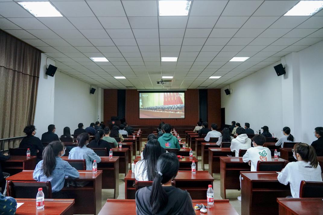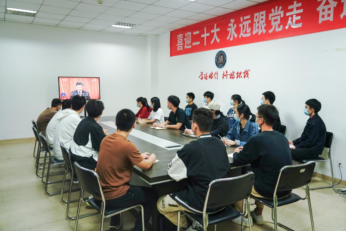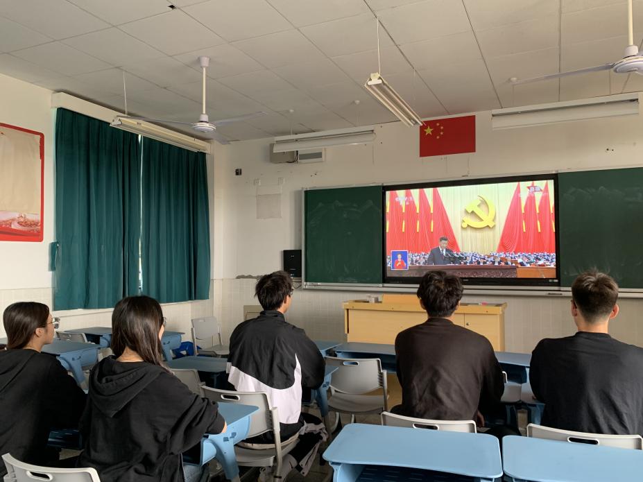 学院党委组织全院师生以线上线下相结合的方式收看大会开幕会。在游泳馆一楼会议室,师生党员代表提前就位,佩戴党徽,以饱满的精神状态仔细聆听报告。在创新工作室,学院学生组织代表怀着激动的心情,集体收看党的二十大开幕直播。