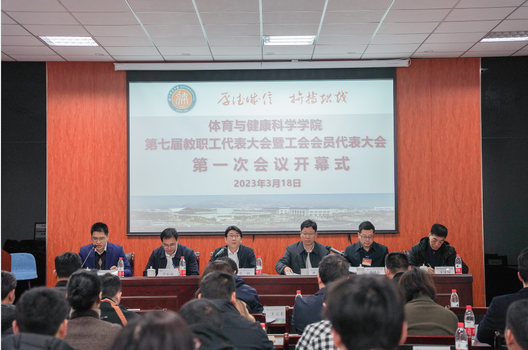 2023年3月18日上午,体育学院第七届教职工代表大会暨工会会员代表大会第一次会议(下称“双代会”)在学院第一会议室隆重召开。校党委委员、副校长林一钢、校工会常务副主席叶志雄出席大会并致辞。特邀代表黄成双、第六届工会主席王守钧应邀参加会议,学院学生会主席、研究生会主席列席会议,来自学院公共体育、专业理论、专业术科、行政后勤的四个代表团42名代表齐聚一堂,共商学院发展大计。