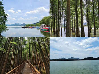 第四站,临安青山湖。青山湖有着“树在水中长,船在林中行,鸟在枝头鸣,人在画中走”的绝美意境。老师们迎着阳光,走进树林,漫步于浮桥、森林中,美景交融在眼前,享受这一刻的清凉。