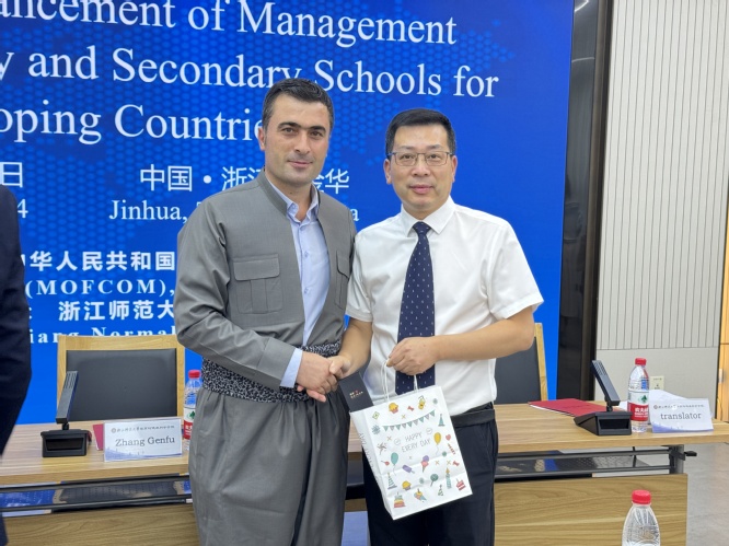 来自伊拉克法赫尔·默加索里国际学校校长奥梅德·法哈德·阿卜杜拉先生(Omed Farhad Abdullah)作为学员代表发言。他表示,这两周的研修学习让学员们在中小学治理方面进行了深入探讨和思想碰撞。此外,在这次研修旅程中,大家学到了也看到了中国丰富多彩的文化,历史,传统和学术发展。所经历的旅程,到过的地方,遇到过的人,都拓展了大家的眼界,加深了对中国文化的欣赏。感谢中国搭建了为不同国家人民沟通的桥梁。