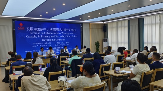 8月20日,2024年发展中国家中小学管理能力提升研修班结业仪式在浙师大举行。研修班由商务部主办、浙师大承办。浙师大校务委员会副主任张根福教授出席仪式并致辞,学院党委书记姜洪友参加上述活动,来自南非、格林纳达、埃塞俄比亚、津巴布韦、卢旺达、基里巴斯、萨摩亚、泰国、毛里求斯、伊拉克等10个国家(地区)的31名学员参加结业仪式。