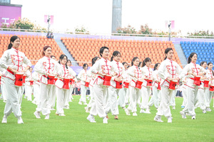 开幕式上,256名学子腰系“中华健身鼓”、身着统一的表演服、伴随着“美丽中国”的悠扬旋律,整齐划一、韵律十足、激情四溢地奉献了一场精彩绝伦的健身鼓演出。鼓声隆隆回响、长龙穿梭飞舞,向观众展示了绝佳风采!