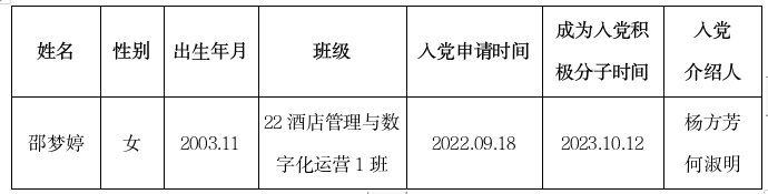 经本人申请,组织审查,支委会讨论研究,拟接收邵梦婷同志为党的发展对象。按照发展党员的程序与规定,现将以下同志有关情况予以公示,请监督。具体公示如下:
