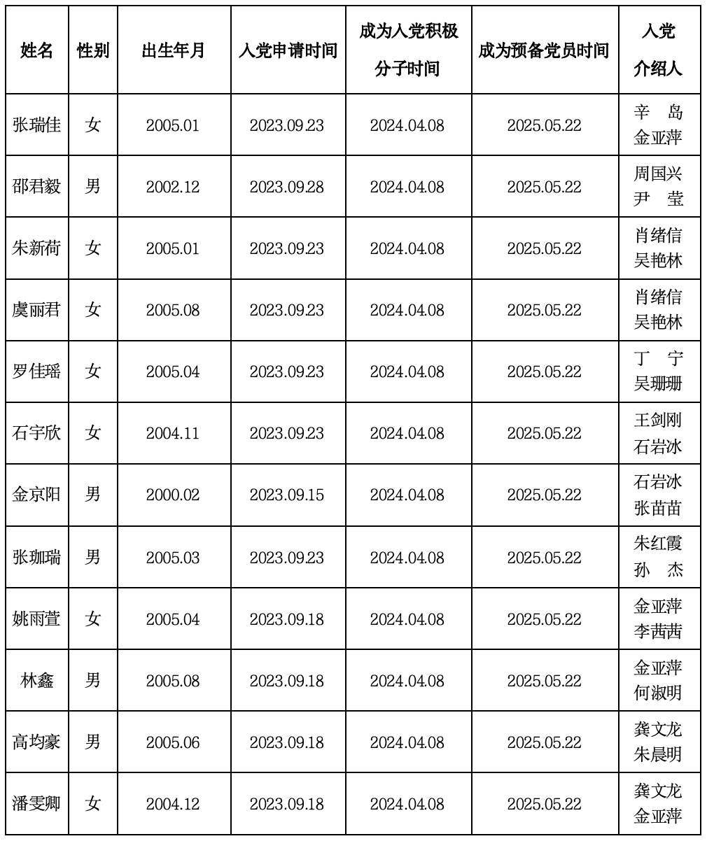 经支委会研究,定于2025年5月22日召开党员支部大会,对张瑞佳等12名发展对象吸收为中共预备党员进行讨论,望广大师生予以监督。如不符合条件,请在公示之日起七天内向本支部或上级党委反映,并提供必要的证据。举报电话:83803652。