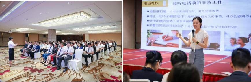 培训从员工个人形象礼仪、接待中的行为规范、接打电话礼仪,各种场合的座次礼仪、会议服务中的斟茶礼仪以及迎来送往中的语言表达规范等方面进行了全方面培训。培训中,教师通过示范和指导与受训员工进行了充分交流,现场学习氛围浓厚。