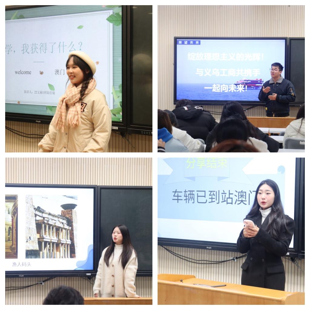 在分享会上,澳门研学归来的优秀学子代表详细介绍了他们在澳门的研学经历和心得体会。他们首先分享了澳门大学的教育特色、课程设置、教学方法以及与内地教育的异同之处。精彩纷呈的研学课堂,使自己的视野得到极大的扩展,进一步培养了开放、包容、接纳的意识,同时也认识到不同文化之间的碰撞交融以及跨文化交流之间的隔阂。最后,研学代表分享了澳门的历史、文化和风土人情,他们通过游览澳门博物馆、海事博物馆、妈祖阁、官也街等,了解到澳门的历史变迁、文化传承以及独特的建筑风格。