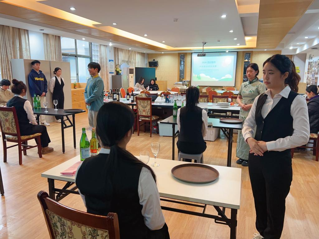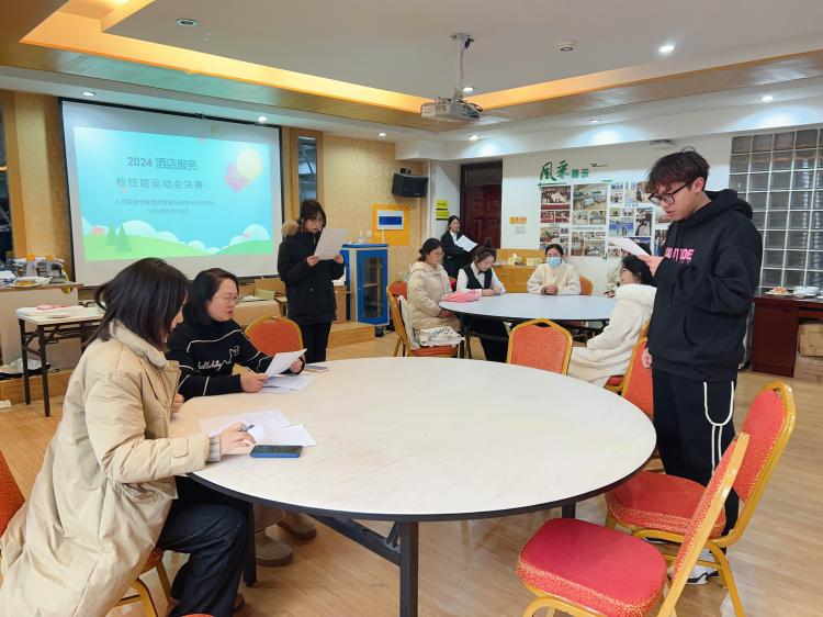 决赛分为对客服务形象与技能展示、英语对客交流能力展示两个部分。参赛学生热情洋溢,认真准备,积极投入,同学们在一起比酒店职业礼仪、比酒店专业知识、比酒店行业技能,最终顺利完成了本次比赛的预期目标,为2024年酒店服务省赛选出了参赛苗子。