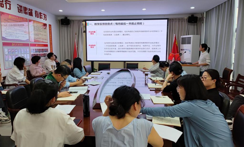 此外,杨老师强调了教学反馈在教学过程中的重要性。她指出,教学反馈督查点主要包括作业布置情况、作业批改情况以及学生的课堂反馈等。通过这些督查点,教师可以及时了解学生的学习状况,发现教学中存在的问题,并及时进行调整。