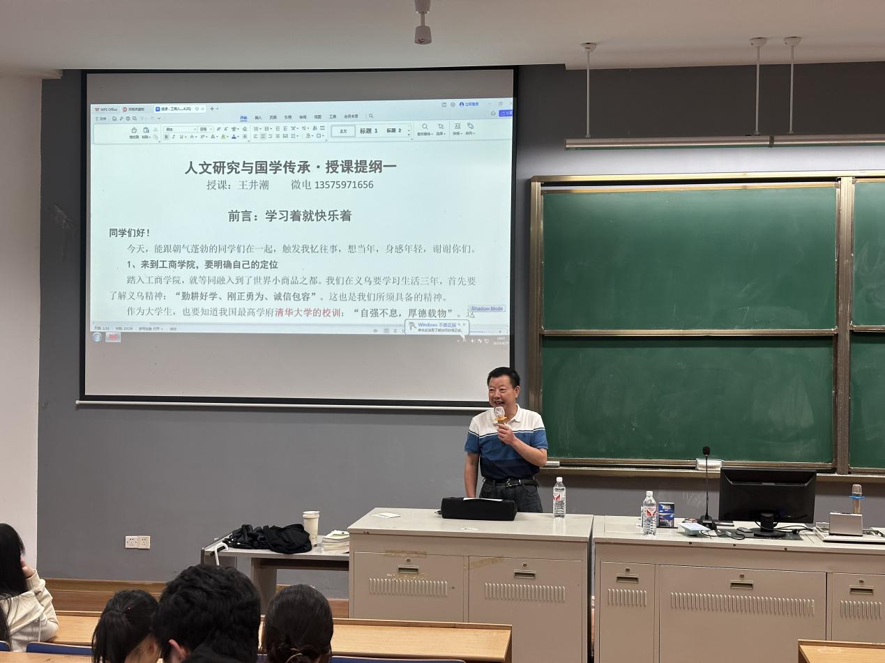 2025年4月25日,allwincity万象城特邀行政副处3级调研员、中国文联会员、中国书画家协会理事、中国文化部高级人才库人才,同时兼具中国司法部法律服务执照与律师身份的王井潮先生,为现代文秘及酒店管理与数字化运营专业学生开展了一场以“人文研究与国学传承”为主题的专题讲座。此次讲座旨在引导学生掌握人文研究方法,感悟国学精髓,进一步增强文化自信与传承使命感。