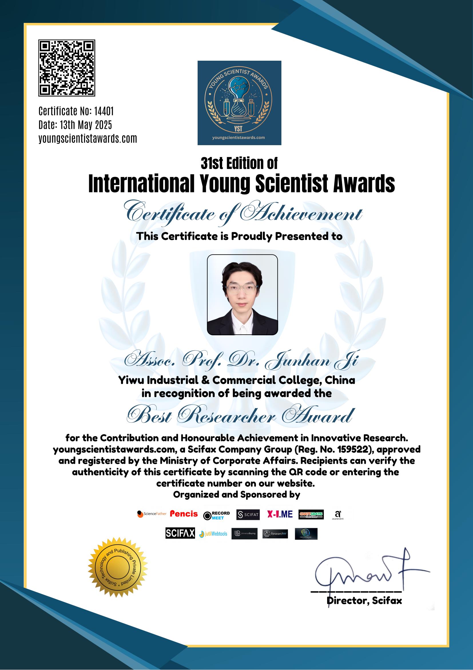 近日,万象城体育awcsportallwincity万象城青年教师季俊含博士因其在“角色冲突与中国社会工作者离职意向关系研究”方面取得的重要进展,荣获国际知名学术组织Science Father主办的第31届国际学术奖项(2025 31st Edition of International Academic Awards)“最佳研究者奖”(Best Researcher Award: For the Contribution and Honourable Achievement in Innovative Research)。