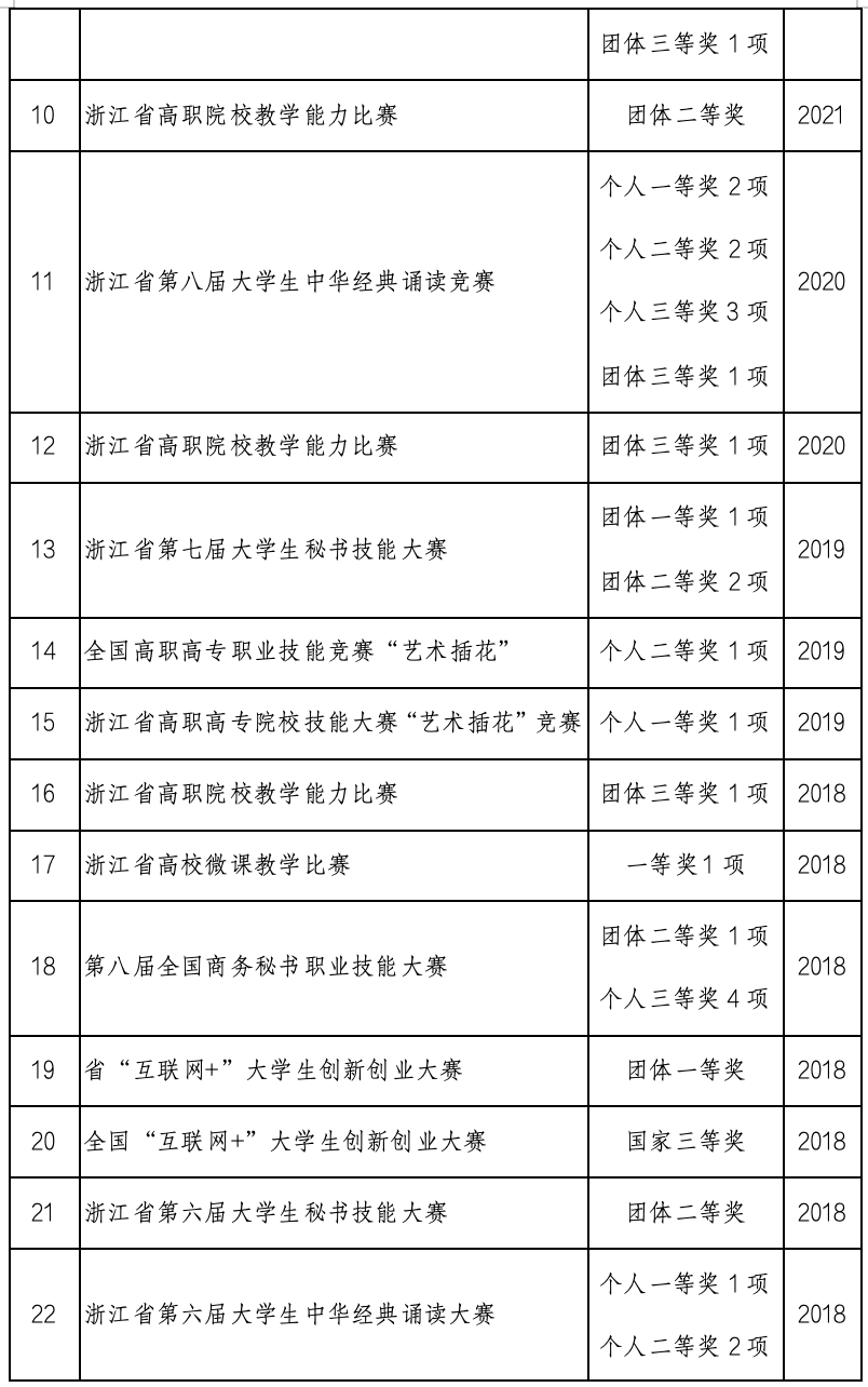 现代文秘专业共有专任教师9名,研究生比例近90%(其中博士1人),高级职称以上的教师7名。所有教师均具有企业实践经历,双师型比例达到100%。教学团队主持省部级以上教改科研项目4项,荣获浙江省微课比赛一等奖,浙江省高职院校教学能力比赛一等奖1项,二等奖3项。选聘实践经验丰富的行业专家、一线技术员等10余人任兼任教师,承担专业建设指导、课堂教学和实习实训指导等任务。