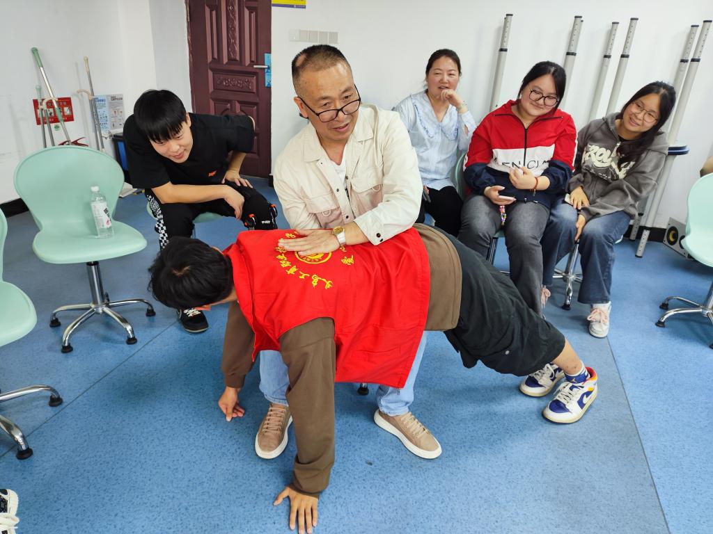 第三个环节是实操部分。同学们以寝室为单位进行分组,分别就应急救护的技巧和方法进行了练习,计院长则在旁边进行手把手指导和纠错。做中学,学中做,同学们在学习了急救知识的同时,更是通过亲身施救中技巧的运用实现了知识的内化于心。